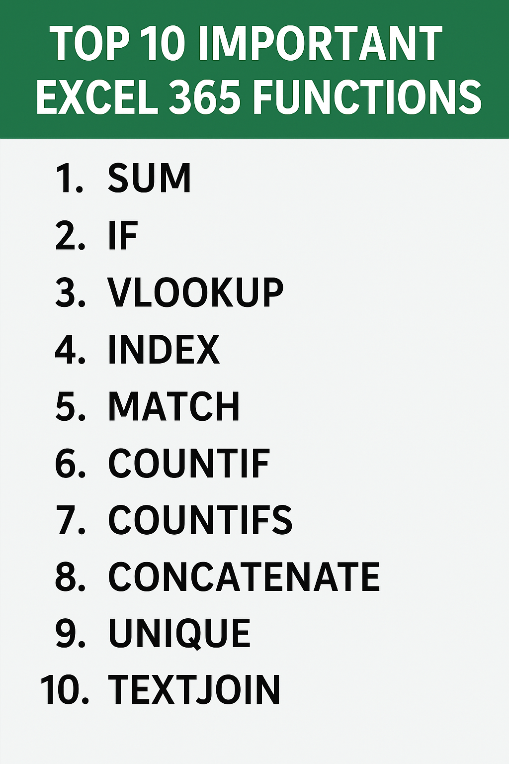 ✅ 1. SUM() – Add Numbers Easily Adds all numbers in a selected range.Example:=SUM(A1:A10)Adds values from A1 to A10. ✅